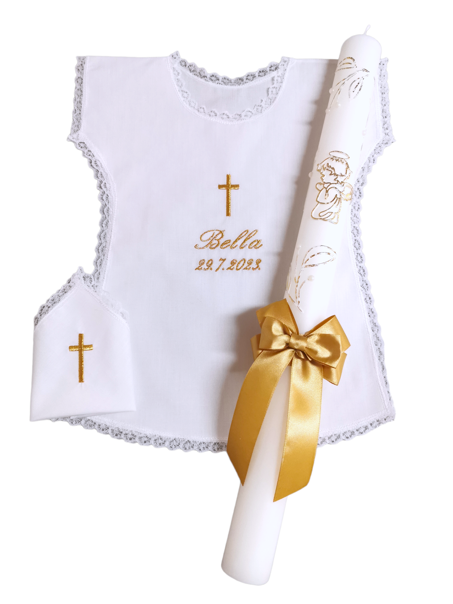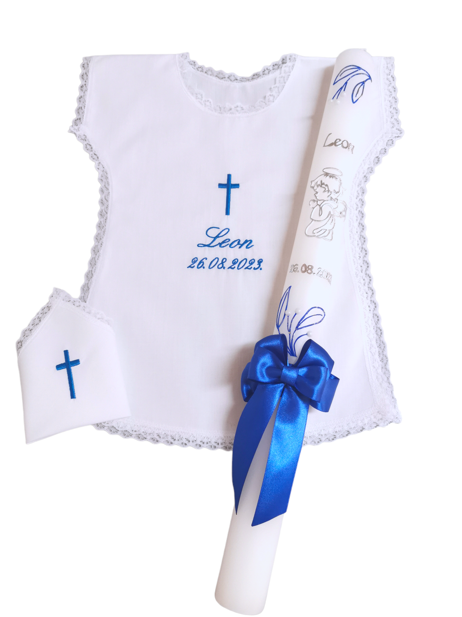 Budite spremni za velik dan Vašeg mališana. Izaberite između velike ponude krsnih kompleta ili pak izaberite svaki proizvod pojedinačno. Svi naši krsni kompleti, kao i pojedinačni proizvodi za krštenje nude velik broj opcija, od motiva, boja pa sve do natpisa. Tako možete birati razne motive na krsnim košuljicama i rupčićima, natpise različitih boja, te boje koje će se nalaziti na svijeći. Naše krsne svijeće ručni su rad, te svaka od njih može biti personalizirana i jedinstvena. Sve zbog toga kako bi Vi mogli izabrati savršen krsni komplet za Vaše dijete.