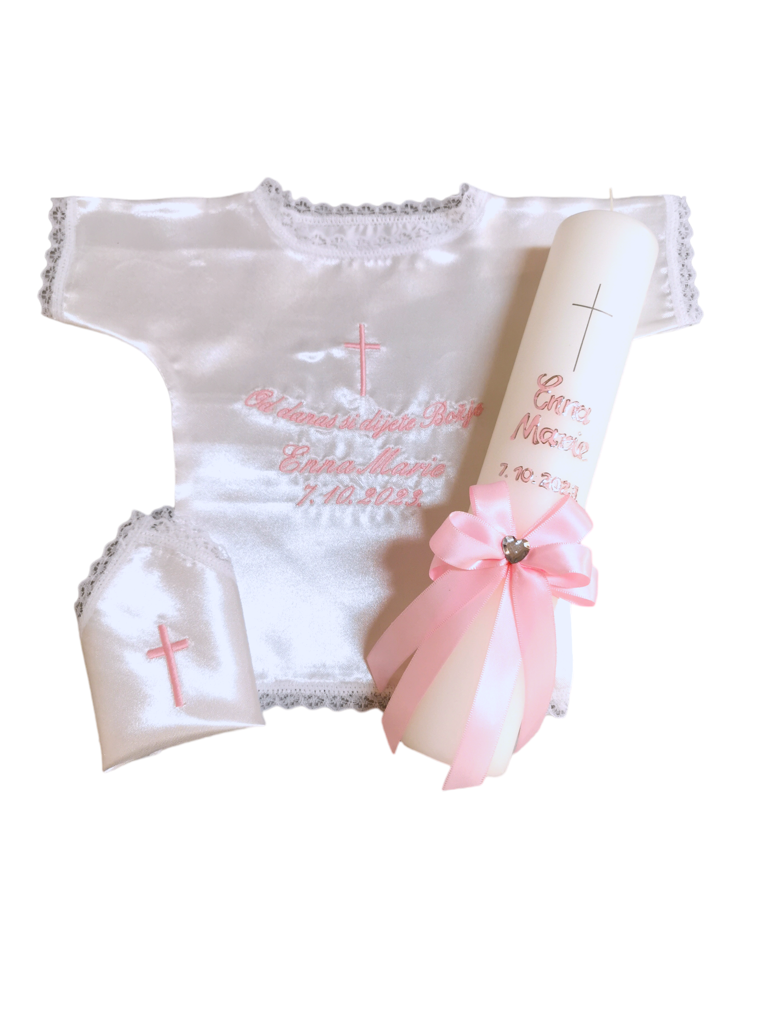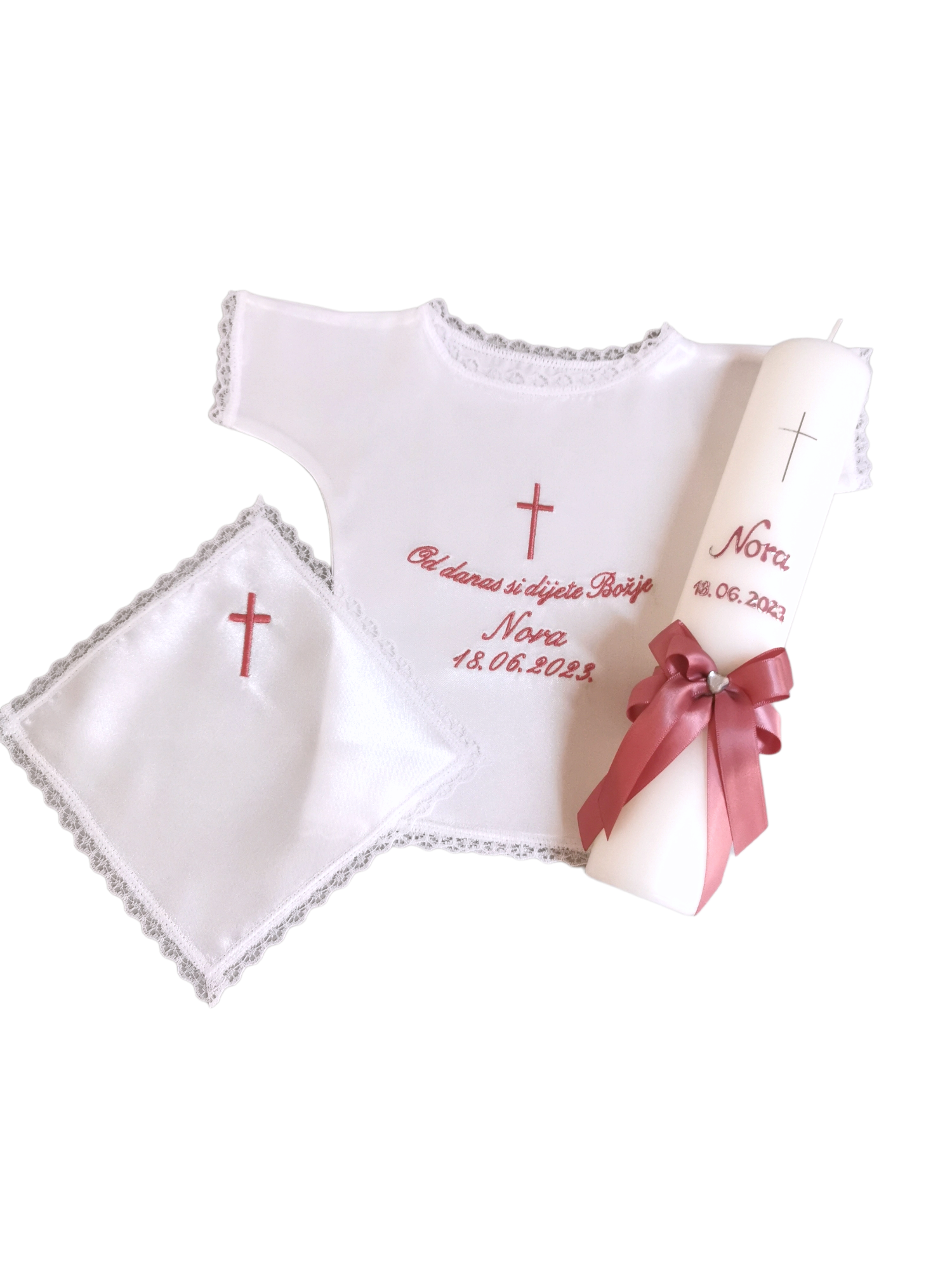 Budite spremni za velik dan Vašeg mališana. Izaberite između velike ponude krsnih kompleta ili pak izaberite svaki proizvod pojedinačno. Svi naši krsni kompleti, kao i pojedinačni proizvodi za krštenje nude velik broj opcija, od motiva, boja pa sve do natpisa. Tako možete birati razne motive na krsnim košuljicama i rupčićima, natpise različitih boja, te boje koje će se nalaziti na svijeći. Naše krsne svijeće ručni su rad, te svaka od njih može biti personalizirana i jedinstvena. Sve zbog toga kako bi Vi mogli izabrati savršen krsni komplet za Vaše dijete.
