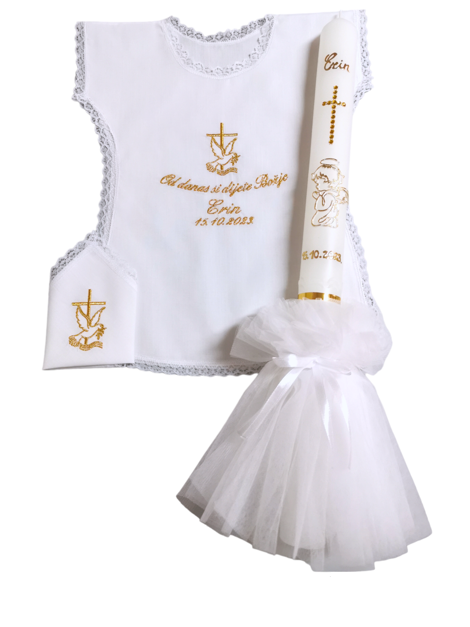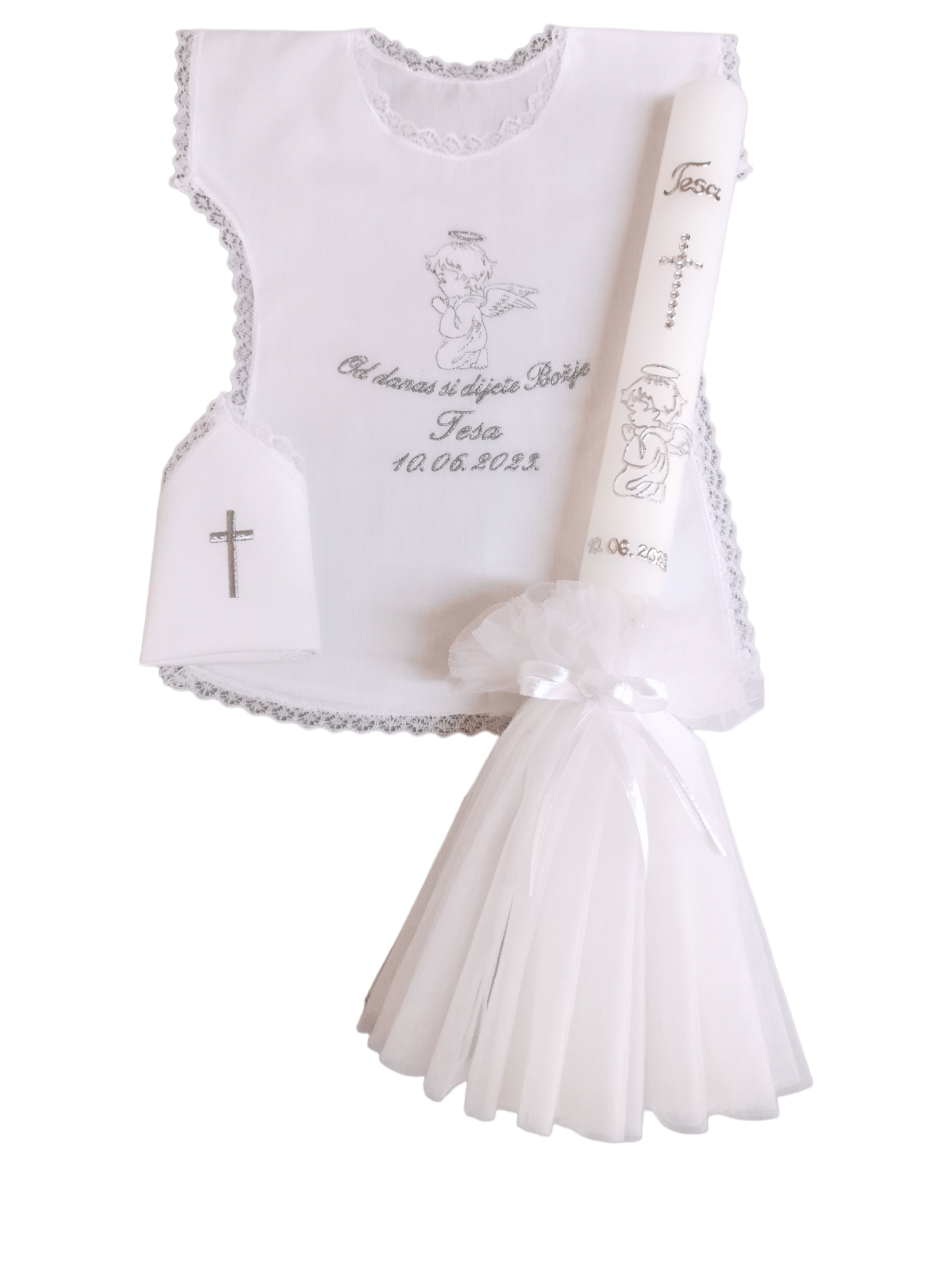 Budite spremni za velik dan Vašeg mališana. Izaberite između velike ponude krsnih kompleta ili pak izaberite svaki proizvod pojedinačno. Svi naši krsni kompleti, kao i pojedinačni proizvodi za krštenje nude velik broj opcija, od motiva, boja pa sve do natpisa. Tako možete birati razne motive na krsnim košuljicama i rupčićima, natpise različitih boja, te boje koje će se nalaziti na svijeći. Naše krsne svijeće ručni su rad, te svaka od njih može biti personalizirana i jedinstvena. Sve zbog toga kako bi Vi mogli izabrati savršen krsni komplet za Vaše dijete.