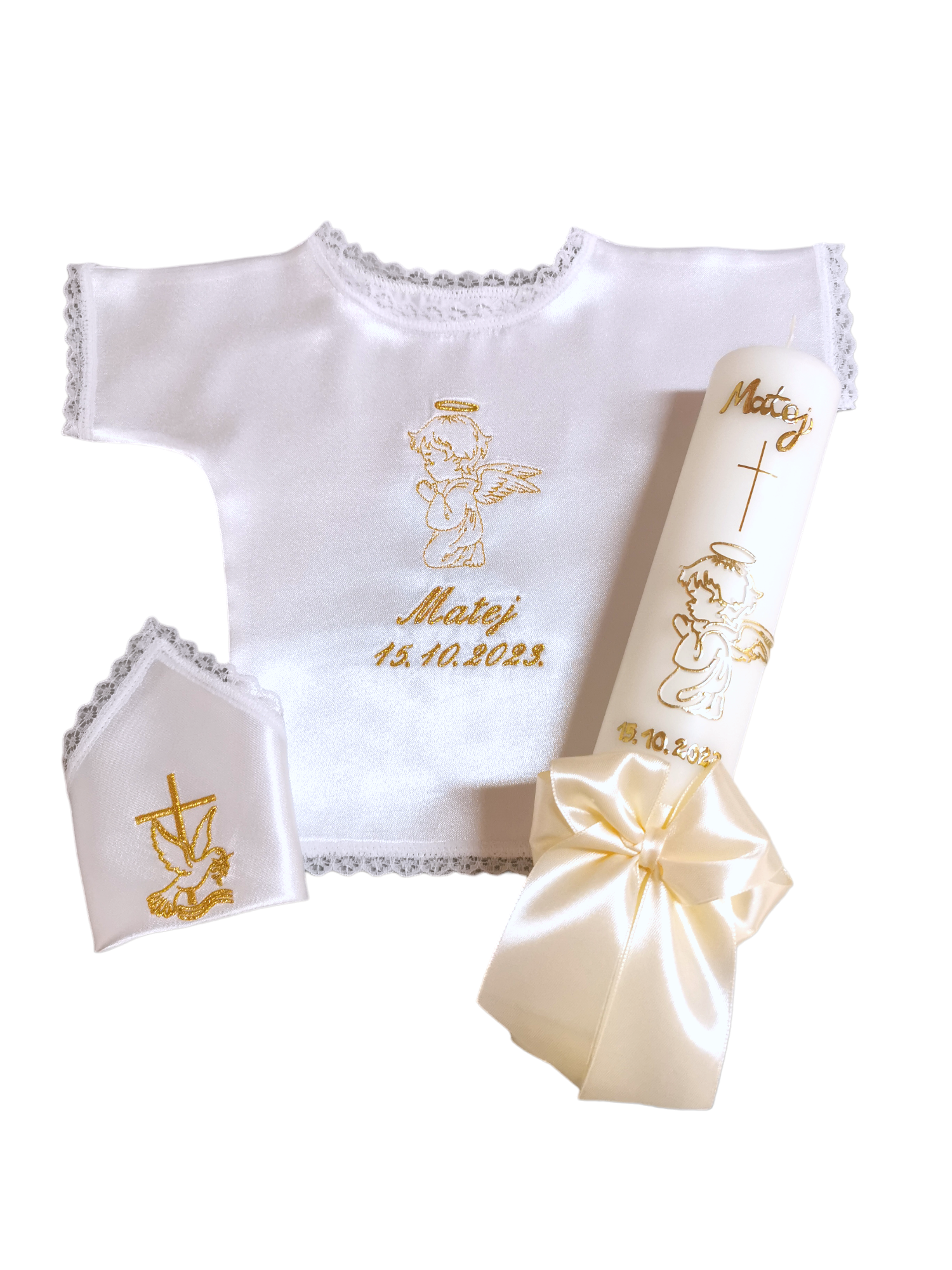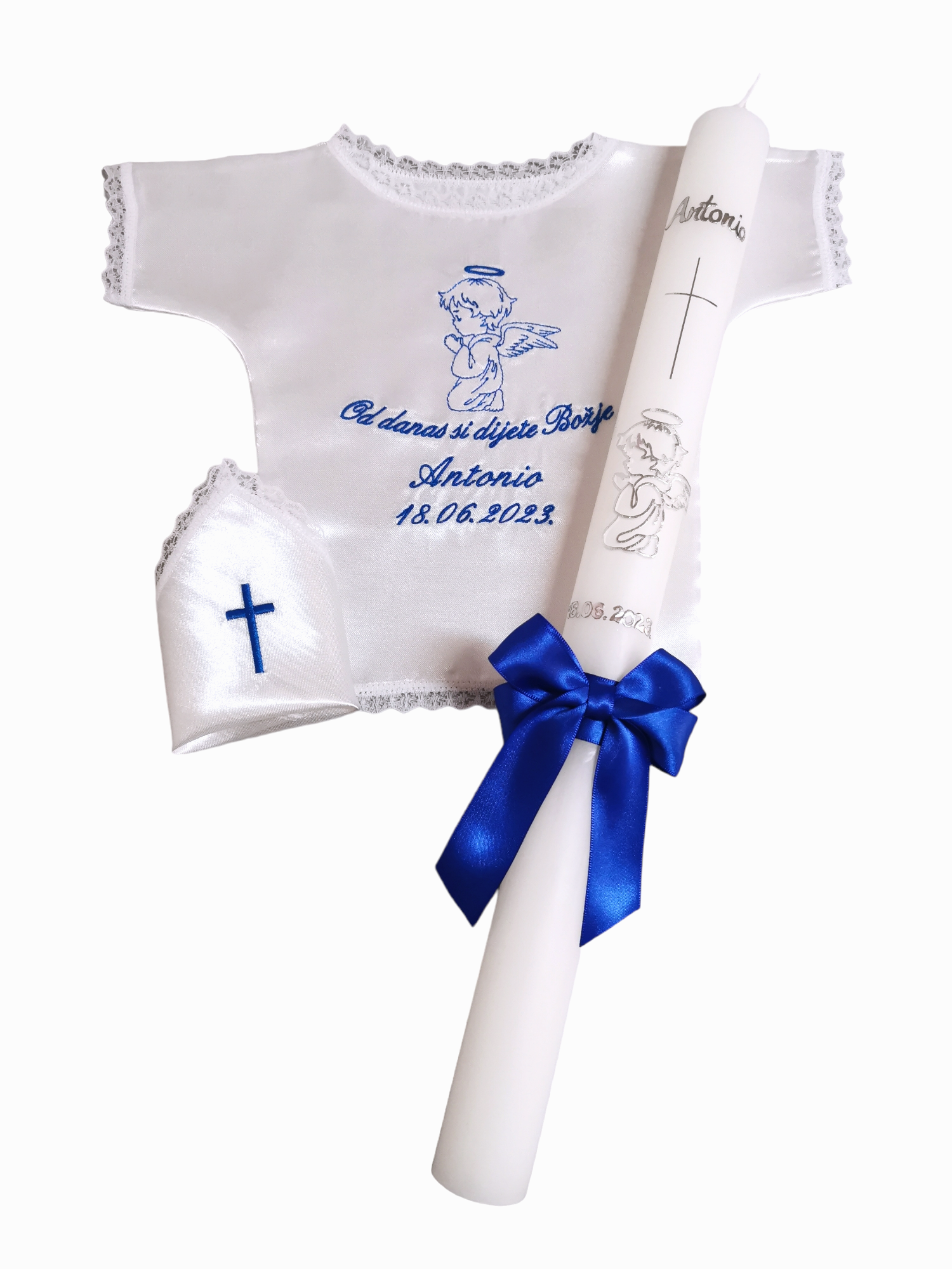 Budite spremni za velik dan Vašeg mališana. Izaberite između velike ponude krsnih kompleta ili pak izaberite svaki proizvod pojedinačno. Svi naši krsni kompleti, kao i pojedinačni proizvodi za krštenje nude velik broj opcija, od motiva, boja pa sve do natpisa. Tako možete birati razne motive na krsnim košuljicama i rupčićima, natpise različitih boja, te boje koje će se nalaziti na svijeći. Naše krsne svijeće ručni su rad, te svaka od njih može biti personalizirana i jedinstvena. Sve zbog toga kako bi Vi mogli izabrati savršen krsni komplet za Vaše dijete.