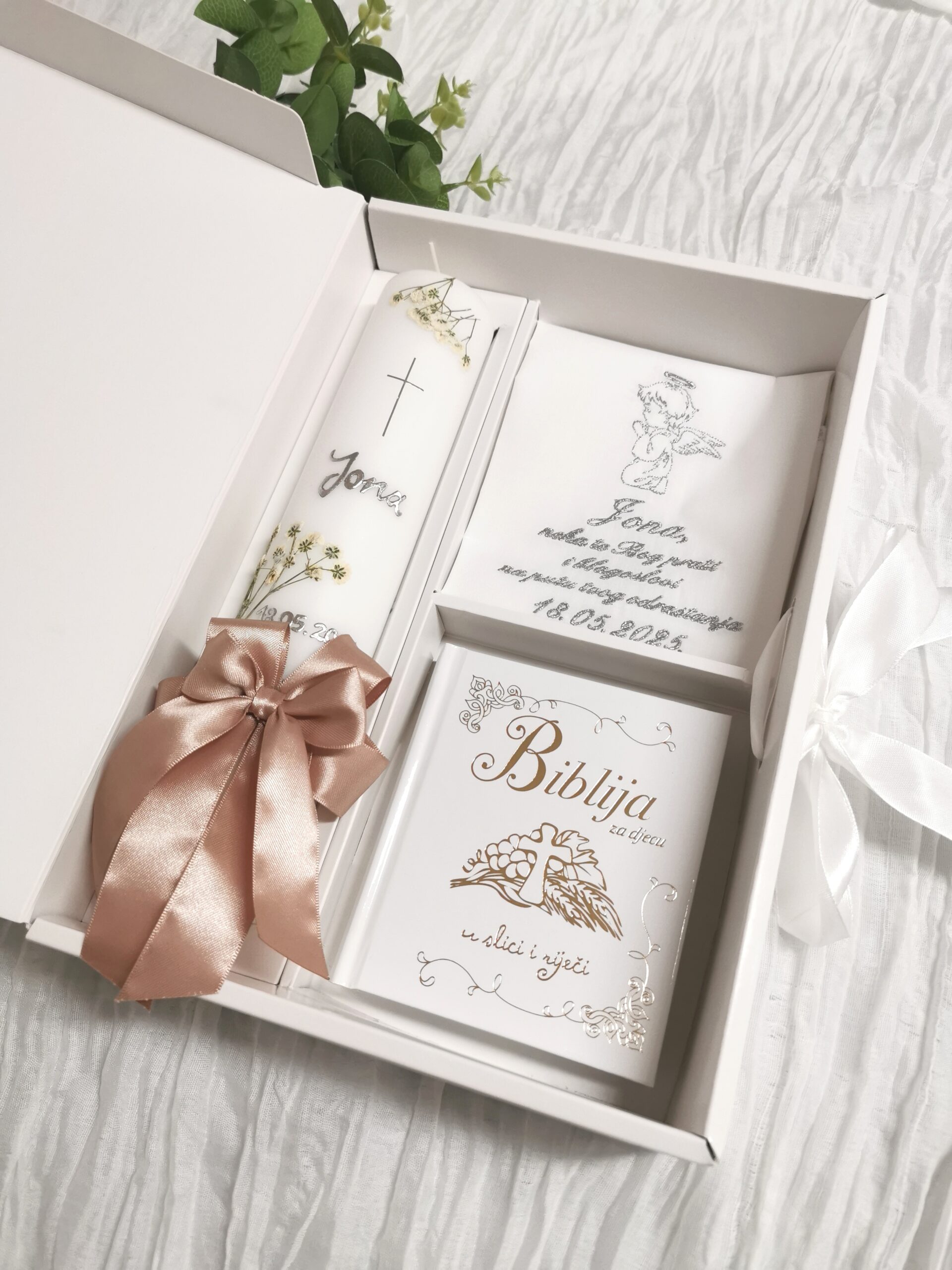 Budite spremni za velik dan Vašeg mališana. Izaberite između velike ponude krsnih kompleta. Svi naši krsni kompleti, kao i pojedinačni proizvodi za krštenje nude velik broj opcija, od motiva, boja pa sve do natpisa. Tako možete birati razne motive na krsnim košuljicama i rupčićima, natpise različitih boja, te boje koje će se nalaziti na svijeći. Naše krsne svijeće ručni su rad, te svaka od njih može biti personalizirana i jedinstvena. Sve zbog toga kako bi Vi mogli izabrati savršen krsni komplet za Vaše dijete.