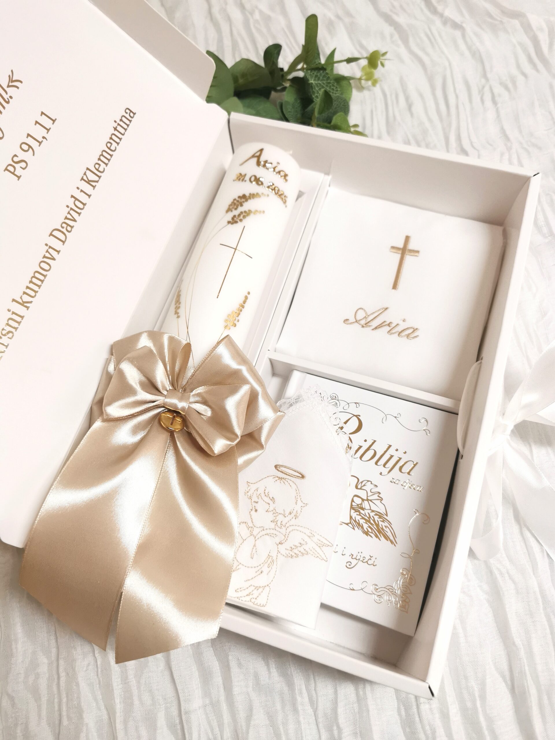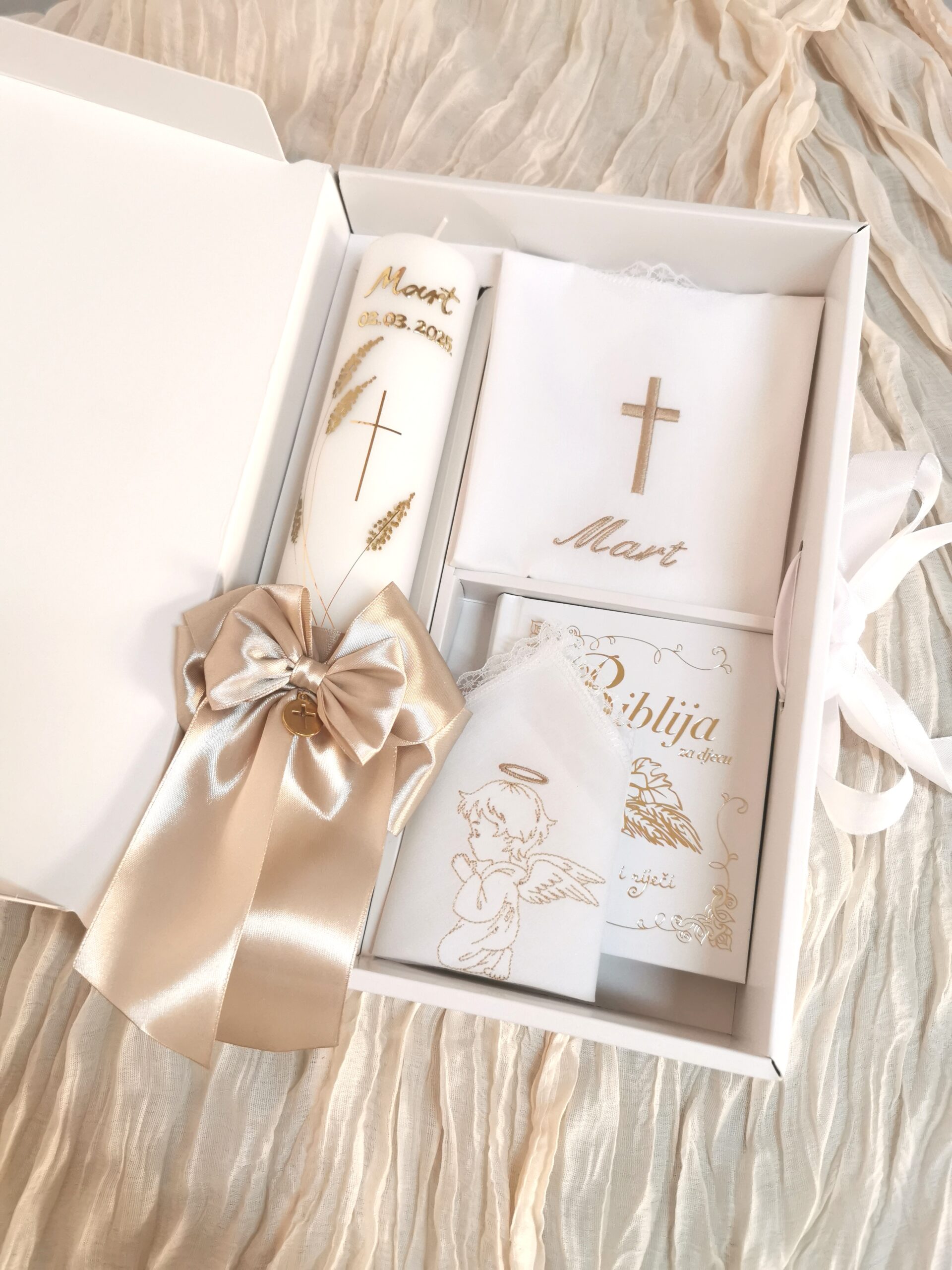 Budite spremni za velik dan Vašeg mališana. Izaberite između velike ponude krsnih kompleta. Svi naši krsni kompleti, kao i pojedinačni proizvodi za krštenje nude velik broj opcija, od motiva, boja pa sve do natpisa. Tako možete birati razne motive na krsnim košuljicama i rupčićima, natpise različitih boja, te boje koje će se nalaziti na svijeći. Naše krsne svijeće ručni su rad, te svaka od njih može biti personalizirana i jedinstvena. Sve zbog toga kako bi Vi mogli izabrati savršen krsni komplet za Vaše dijete.