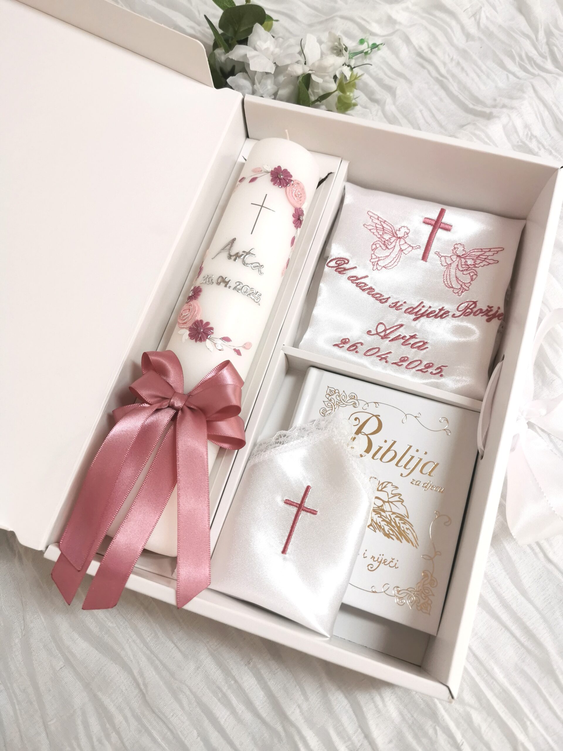 Budite spremni za velik dan Vašeg mališana. Izaberite između velike ponude krsnih kompleta. Svi naši krsni kompleti, kao i pojedinačni proizvodi za krštenje nude velik broj opcija, od motiva, boja pa sve do natpisa. Tako možete birati razne motive na krsnim košuljicama i rupčićima, natpise različitih boja, te boje koje će se nalaziti na svijeći. Naše krsne svijeće ručni su rad, te svaka od njih može biti personalizirana i jedinstvena. Sve zbog toga kako bi Vi mogli izabrati savršen krsni komplet za Vaše dijete.