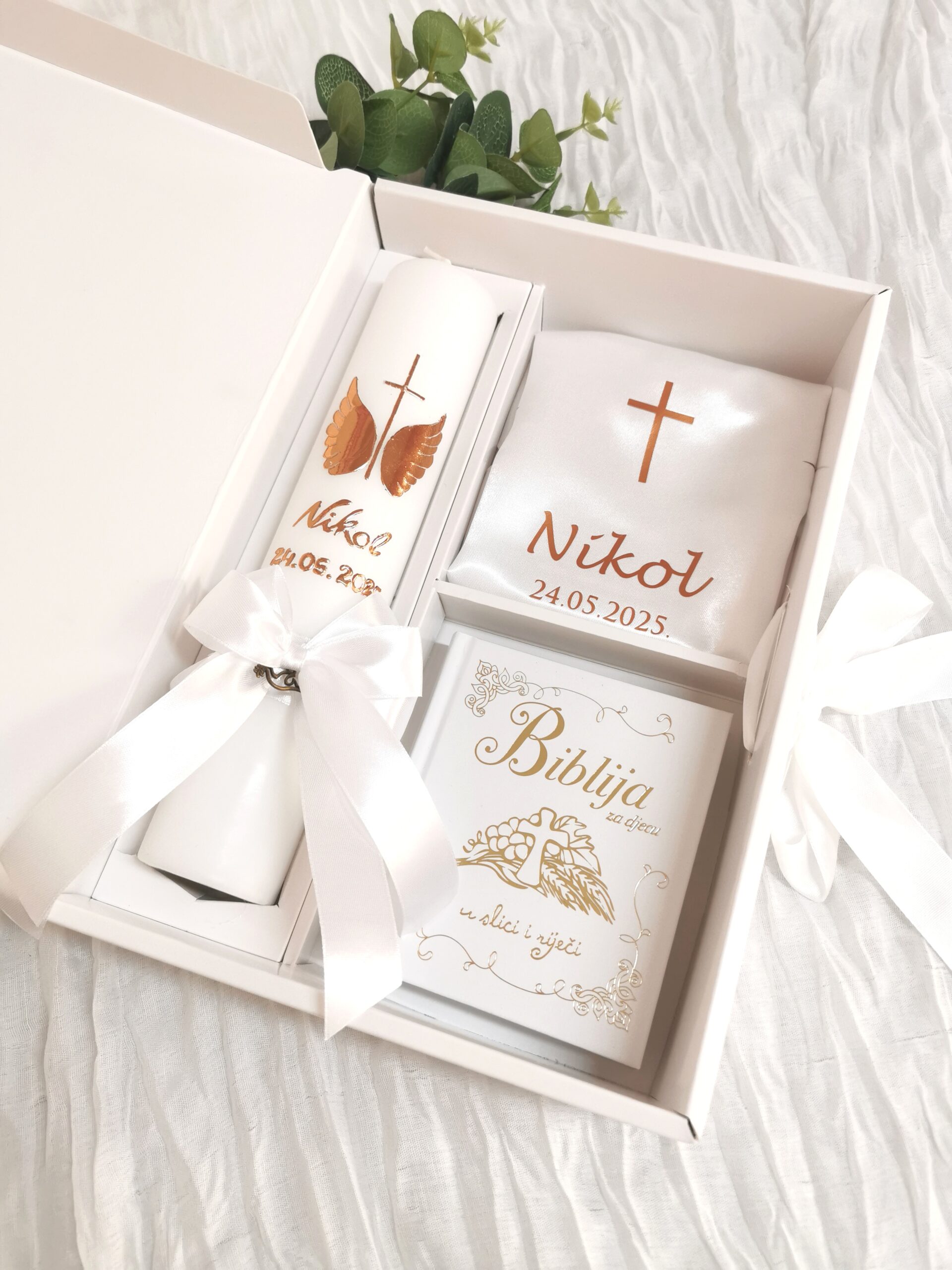 Budite spremni za velik dan Vašeg mališana. Izaberite između velike ponude krsnih kompleta. Svi naši krsni kompleti, kao i pojedinačni proizvodi za krštenje nude velik broj opcija, od motiva, boja pa sve do natpisa. Tako možete birati razne motive na krsnim košuljicama i rupčićima, natpise različitih boja, te boje koje će se nalaziti na svijeći. Naše krsne svijeće ručni su rad, te svaka od njih može biti personalizirana i jedinstvena. Sve zbog toga kako bi Vi mogli izabrati savršen krsni komplet za Vaše dijete.