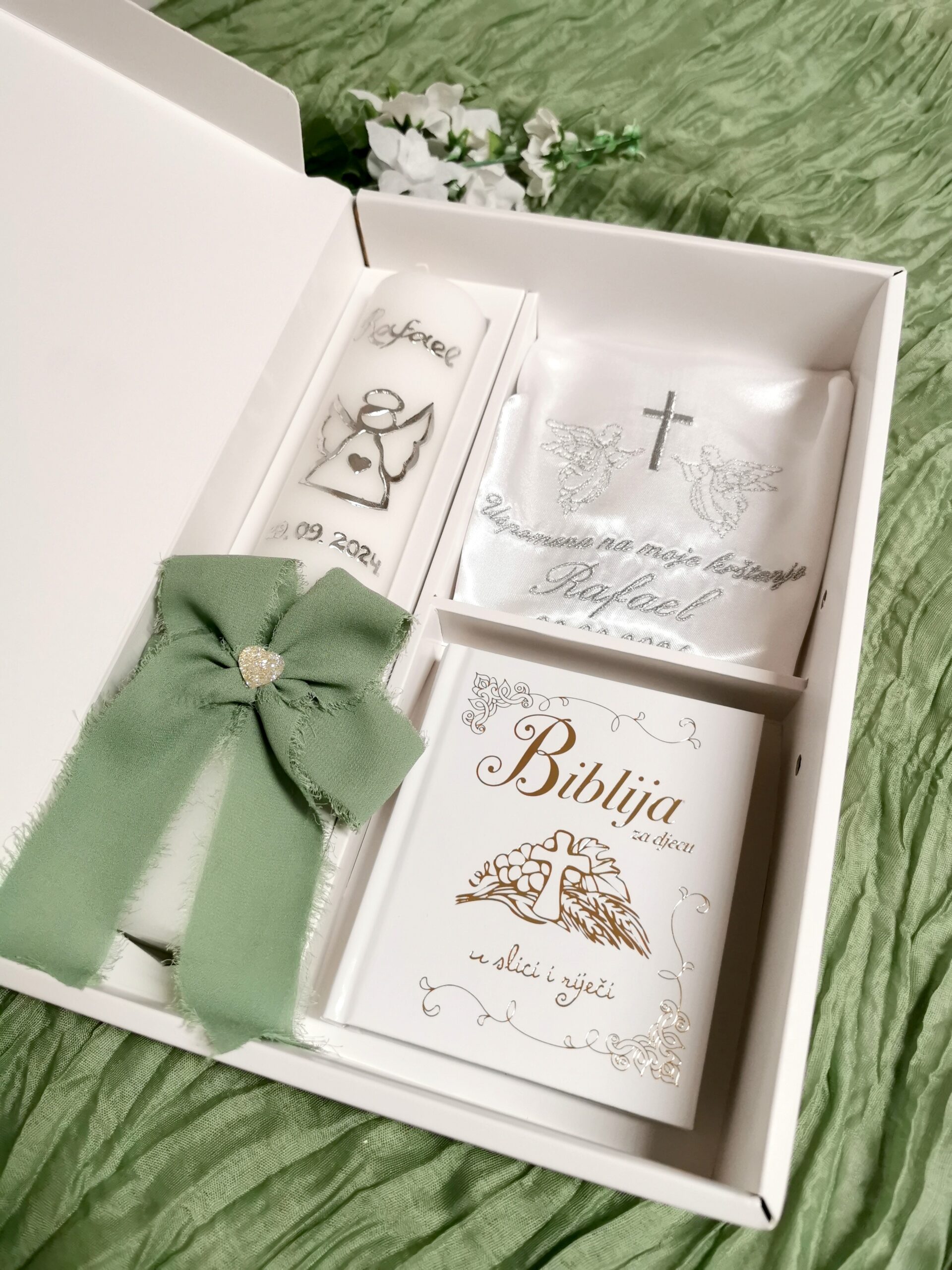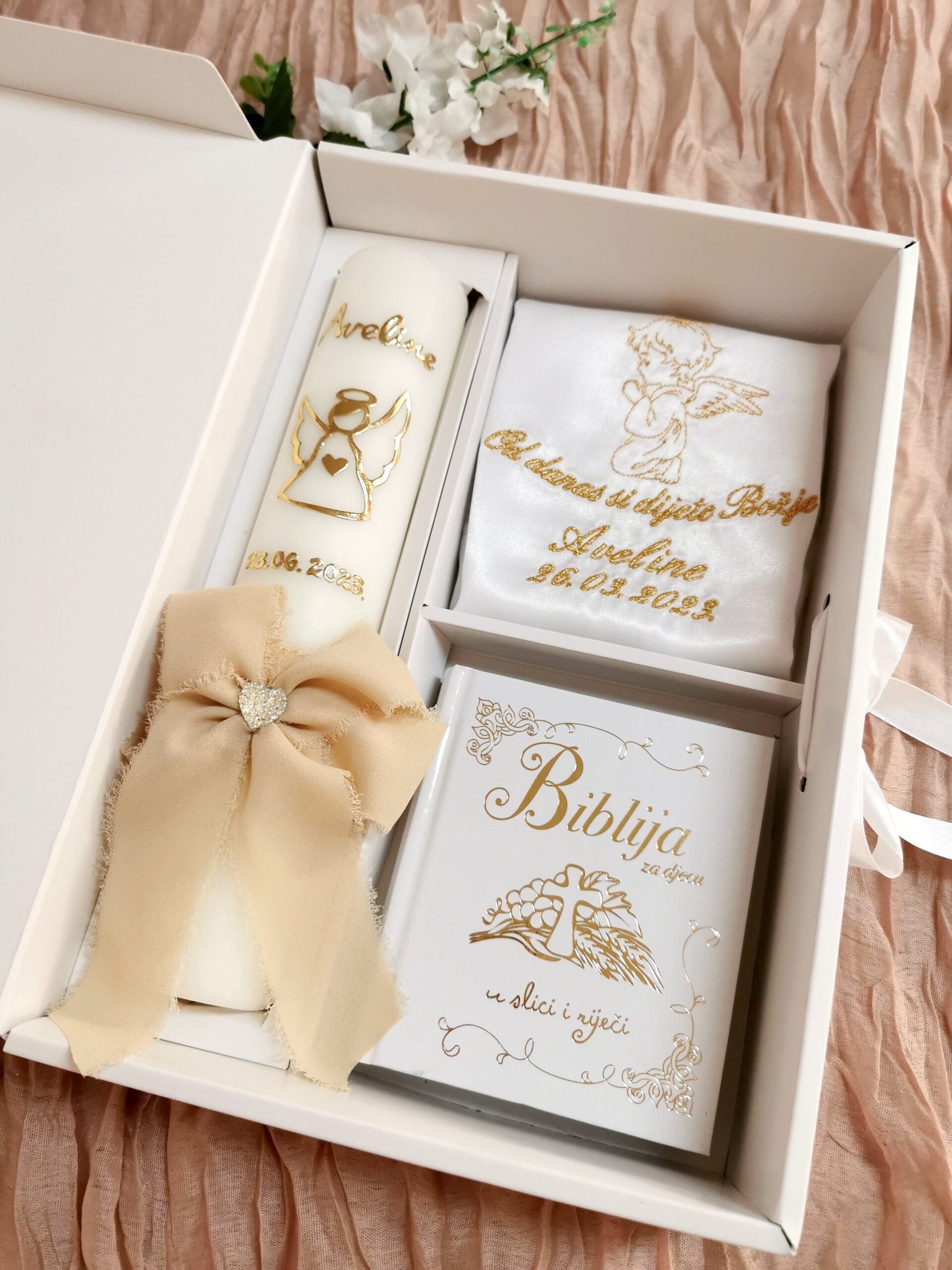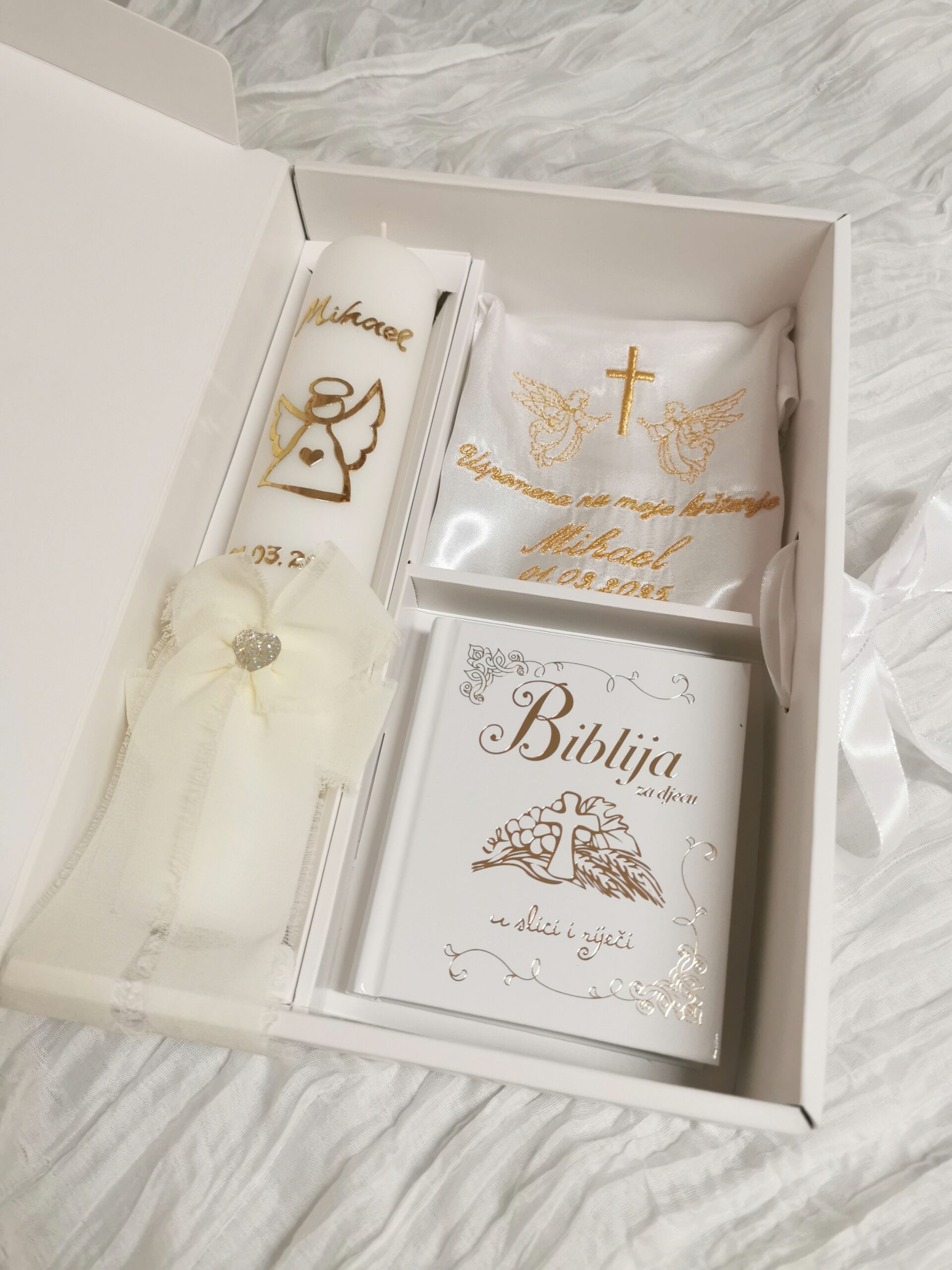Budite spremni za velik dan Vašeg mališana. Izaberite između velike ponude krsnih kompleta. Svi naši krsni kompleti, kao i pojedinačni proizvodi za krštenje nude velik broj opcija, od motiva, boja pa sve do natpisa. Tako možete birati razne motive na krsnim košuljicama i rupčićima, natpise različitih boja, te boje koje će se nalaziti na svijeći. Naše krsne svijeće ručni su rad, te svaka od njih može biti personalizirana i jedinstvena. Sve zbog toga kako bi Vi mogli izabrati savršen krsni komplet za Vaše dijete.