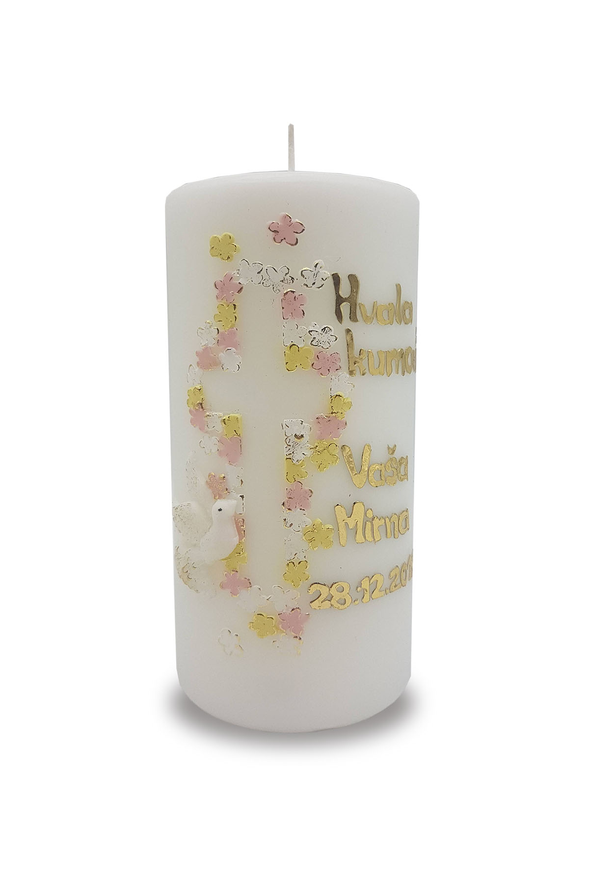Svijeća: napravljena je od kvalitetnog parafinskog voska, ručno rađenih ukrasa i detalja prilagođenim Vama kako bi kumovima ili gostima ostala trajna uspomena na tako poseban i velik dan!
