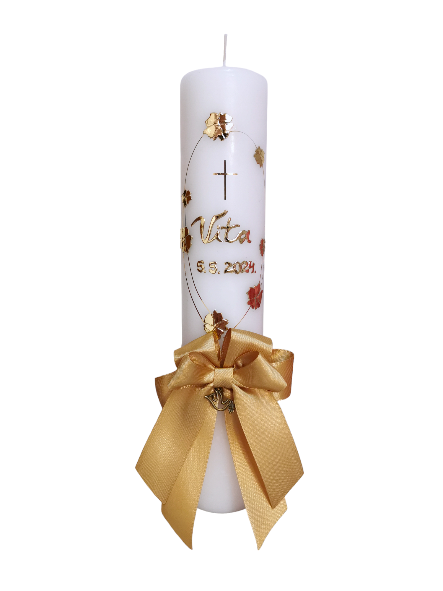 Svijeća: napravljena je od kvalitetnog parafinskog voska, ručno rađenih ukrasa i detalja prilagođenim Vama kako bi Vašem djetetu ostala trajna uspomena na tako poseban i velik dan!