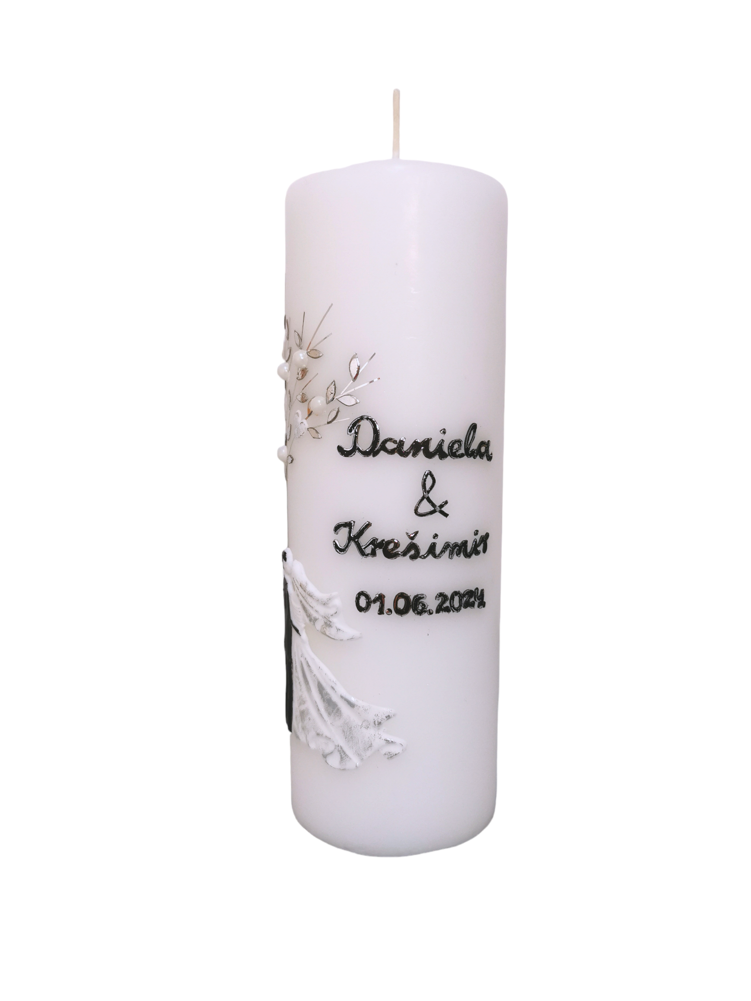 Svijeća: napravljena je od kvalitetnog parafinskog voska, ručno rađenih ukrasa i detalja prilagođenim Vama kako bi Vam ostala trajna uspomena na tako poseban i velik dan!