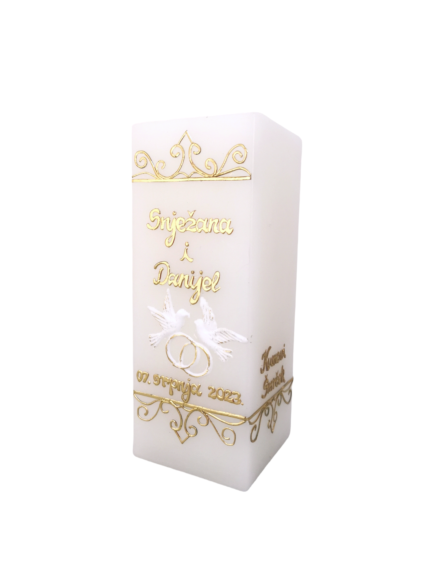 Svijeća: napravljena je od kvalitetnog parafinskog voska, ručno rađenih ukrasa i detalja prilagođenim Vama kako bi Vam ostala trajna uspomena na tako poseban i velik dan!